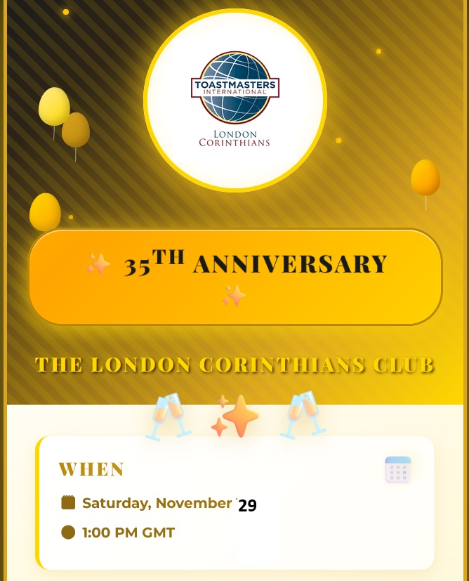 London Corinthians is a Toastmasters club with a difference. Our philosophy, undimmed since formation in 1990 as only the second Toastmasters club in London, is simple. We believe that public speaking is best learned in an atmosphere of enjoyment and high energy – the famed Corinthian buzz. We believe our buzz to be transformational. It makes hesitant speakers good, good speakers exceptional.